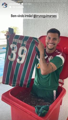 Após a vitória por 2 a 1 sobre o Bragantino, o Fluminense se reapresentou na manhã desta segunda-feira no CT Carlos Castilho com um "reforço": Bruno Guimarães. Nino postou foto em suas redes sociais mostrando o volante do Newcastle, da Inglaterra, fazendo gelo com uniforme de treino tricolor. De férias após o fim do campeonato inglês, o jogador carioca visita a família e está mantendo a forma no clube. Inclusive ganhou uma camisa personalizada com seu nome e o número 39 que usa.
