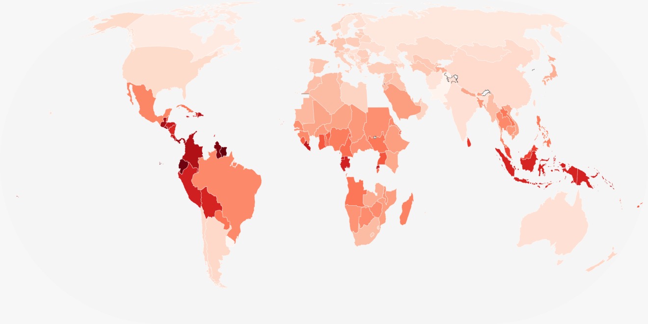 Os países mais impactados foram países localizados próximos à linha do Equador: