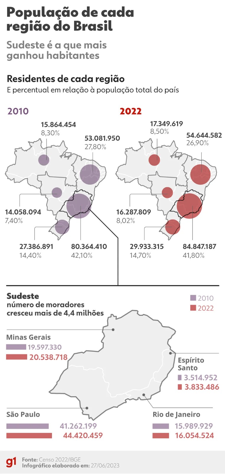- As regiões Sul e Sudeste puxaram o crescimento da população brasileira. O Sudeste ganhou 4.482.777 pessoas, e o Sul, 2.546.424.