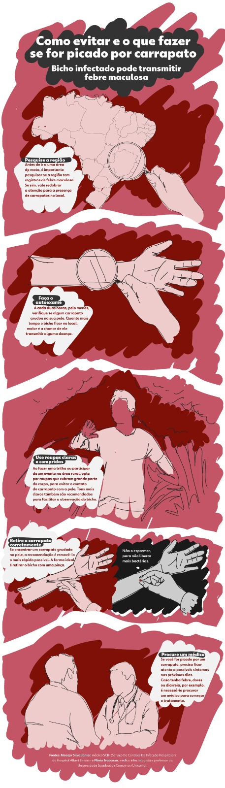 A picada do carrapato costuma ser indolor e, por isso, o infectologista também reforçou a importância de fazer o autoexame para identificar o bicho grudado na pele rapidamente, se possível antes da contaminação.