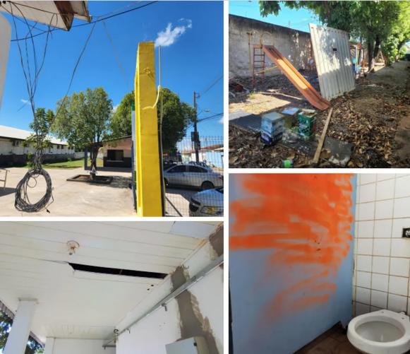 Outros problemas também chamaram atenção dos auditores, como indícios de vandalismo, pichações, mato alto no terreno da escola e itens de material de construção espalhados pelo parquinho.