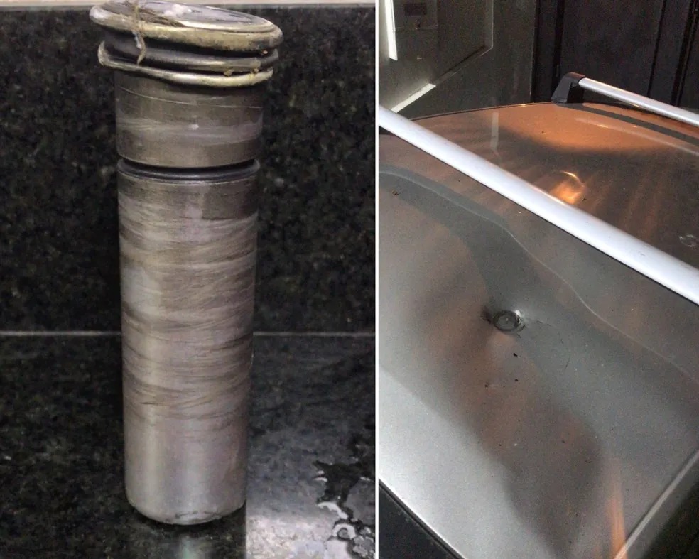 O bancário explica que, no dia seguinte ao aparecimento da peça, a esposa dele foi ver o objeto e notou que o metal estava com cheiro bastante forte. "A ponta estava amassada, com um óleo preto saindo. Além disso, tinha um cheiro podre de ovo".