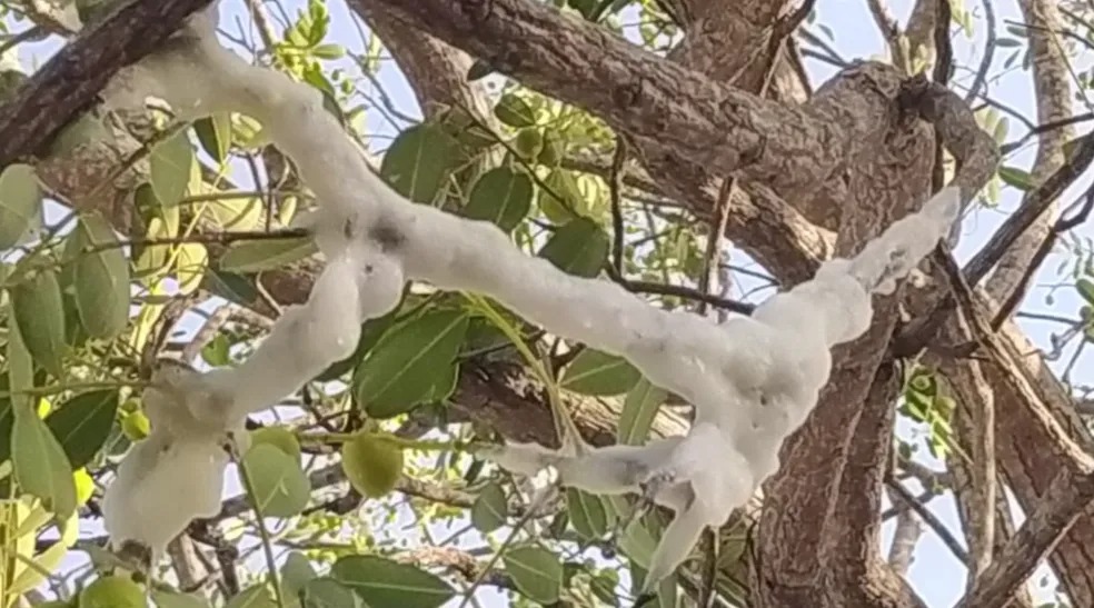 Uma situação inusitada impressionou moradores do Bairro Brejo Seco, em Juazeiro do Norte, no interior do Ceará. O aparecimento de uma substância branca, que pinga um líquido transparente, no alto de uma árvore, aguçou a curiosidade das pessoas, que acreditavam que os galhos da árvore tinham congelado. Isso acontece desde o início do mês de setembro, período quente no interior cearense.