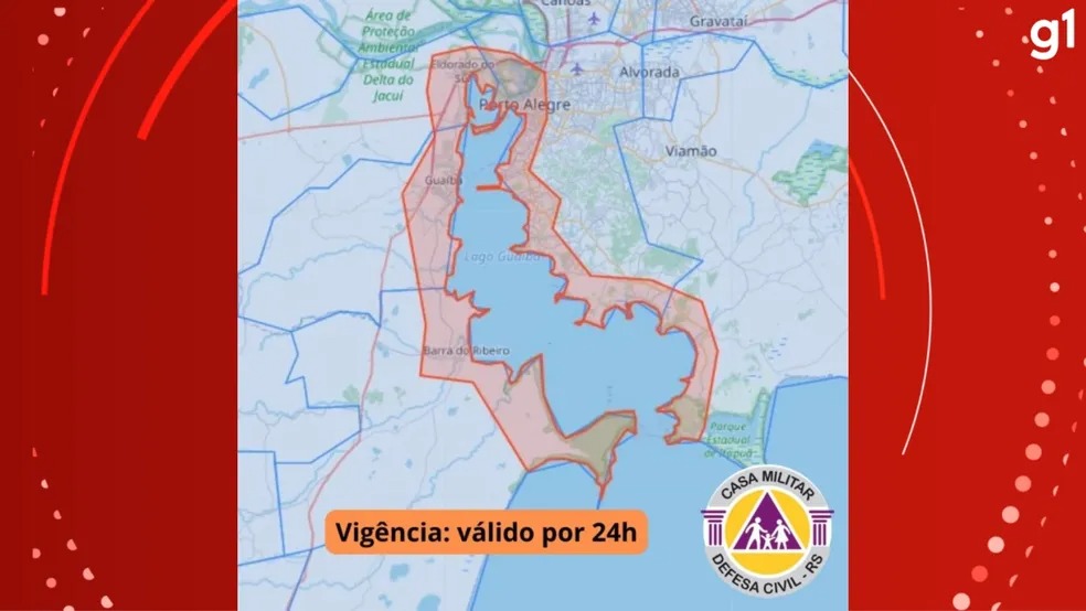 A Defesa Civil do RS emitiu um alerta. De acordo com a instituição, o Guaíba deve atingir o nível de inundação "nas próximas horas". O comunicado, emitido por volta das 7h desta quarta-feira, é válido por 24 horas.