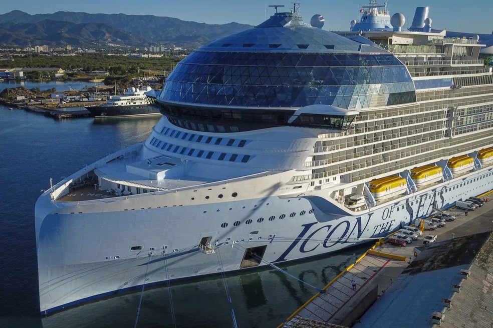 O navio atracou em Miami no último dia 10. A Royal Caribbean International diz que, apesar do tamanho, o Icon of The Seas Roy, vai emitir menos gases poluentes.