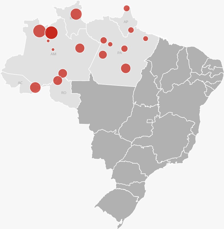 No Amazonas, há cidades em que esse índice sobe para 50% (Santa Isabel do Rio Negro e São Gabriel da Cachoeira). No entanto, na média, somando todos os municípios estudados, o volume geral é menor que Roraima. (Veja detalhes no mapa abaixo)