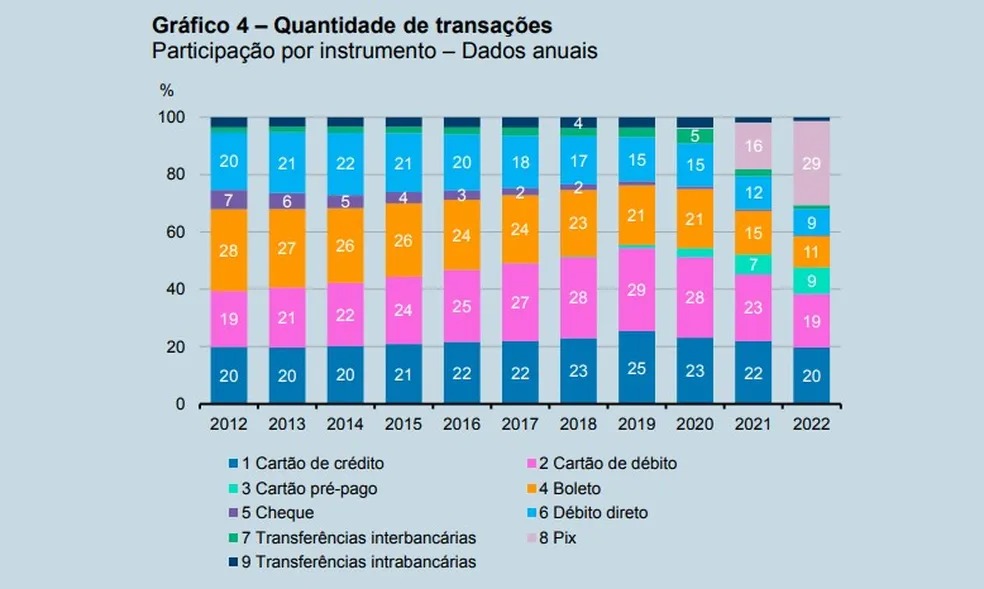"A partir do final de 2020, o expressivo crescimento do uso do PIX reduziu, em termos relativos, a participação dos demais meios de pagamento e de transferência na quantidade total de transações financeiras", informou o Banco Central.