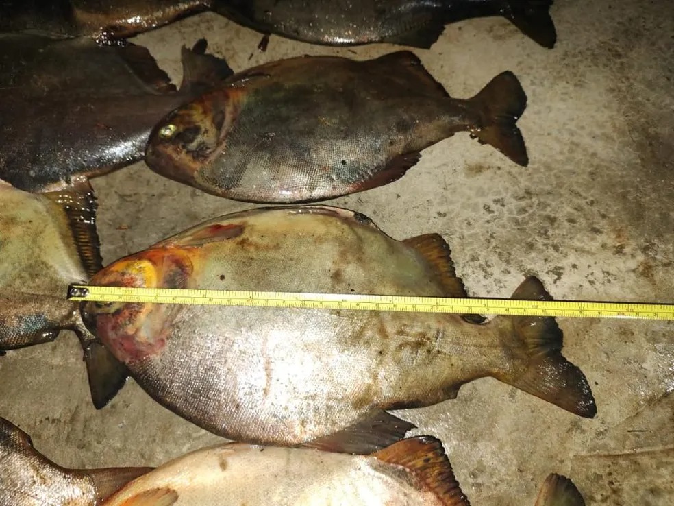 Os policiais realizaram a abordagem da embarcação ocasião em que se depararam com dezenas de pescadas fora da medida, sendo 20 pacus (com tamanhos entre 25 a 37 centímetros), uma piraputanga (de 27 centímetros) e três piranhas.